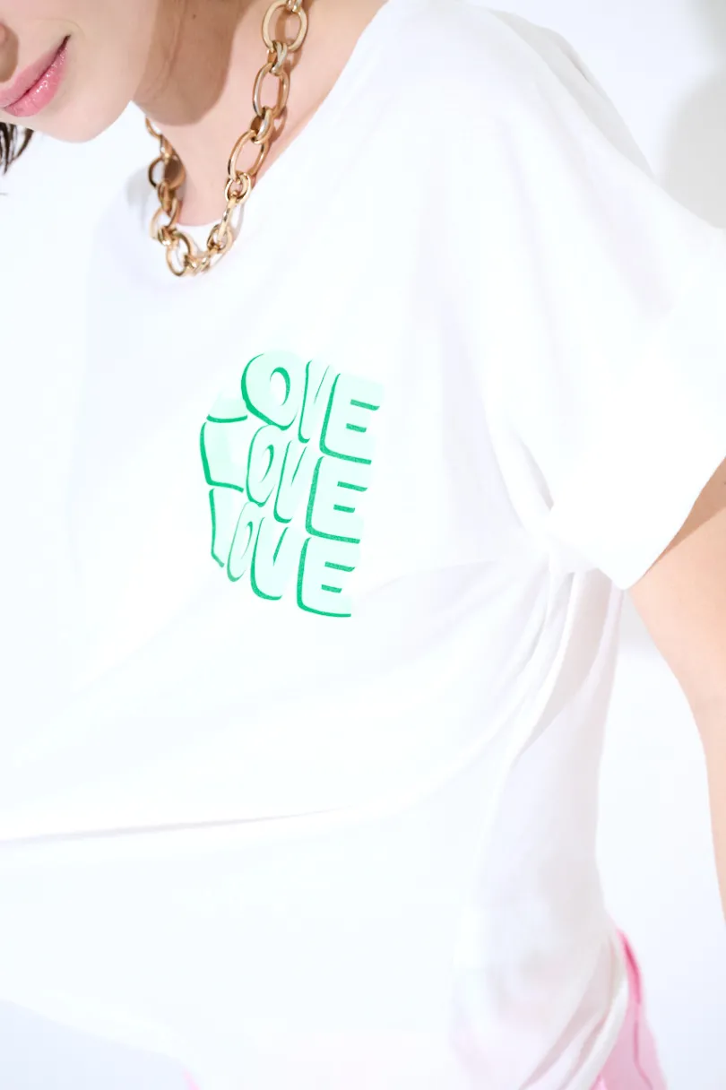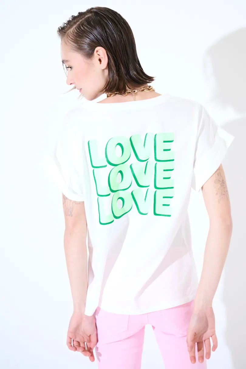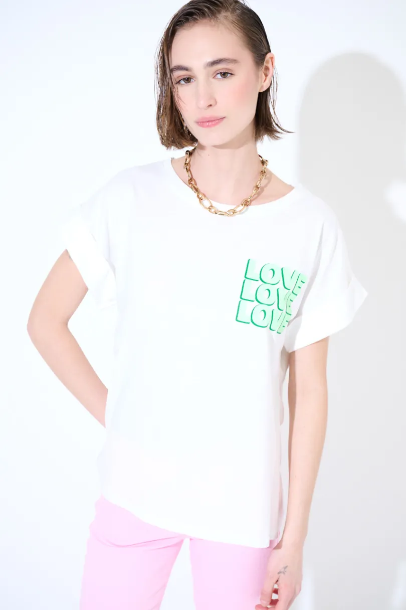 T-shirt girocollo con manica ad aletta con risvolto, con stampa love sia fronte che sul retro.