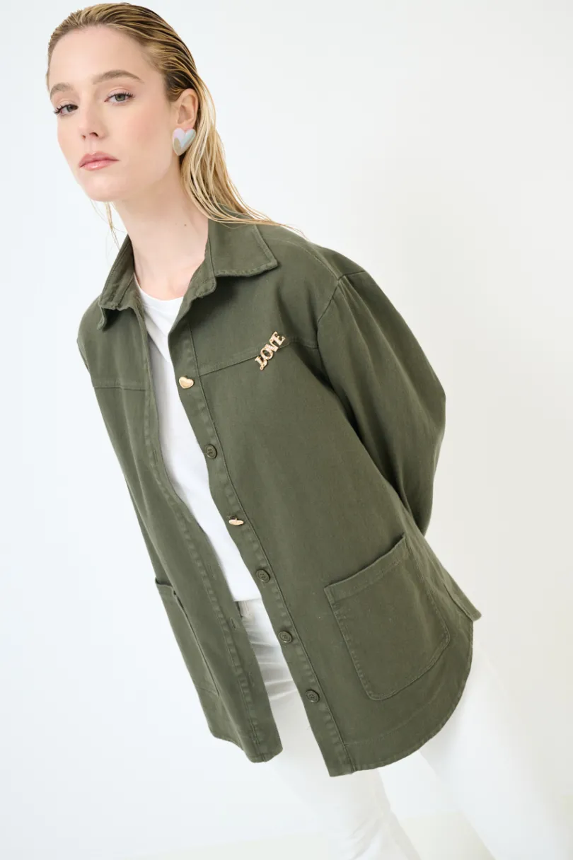 Camicia stile military con taschini, con spilla e bottoni dorati a cuore sul davanti e stampa “Love me” sulla schiena, abbottonata sul davanti.