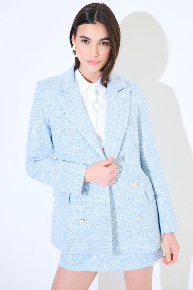 Giacca chanel doppiopetto con paillettes, con bottoni dorati, foderata internamente e con spallina imbottita.