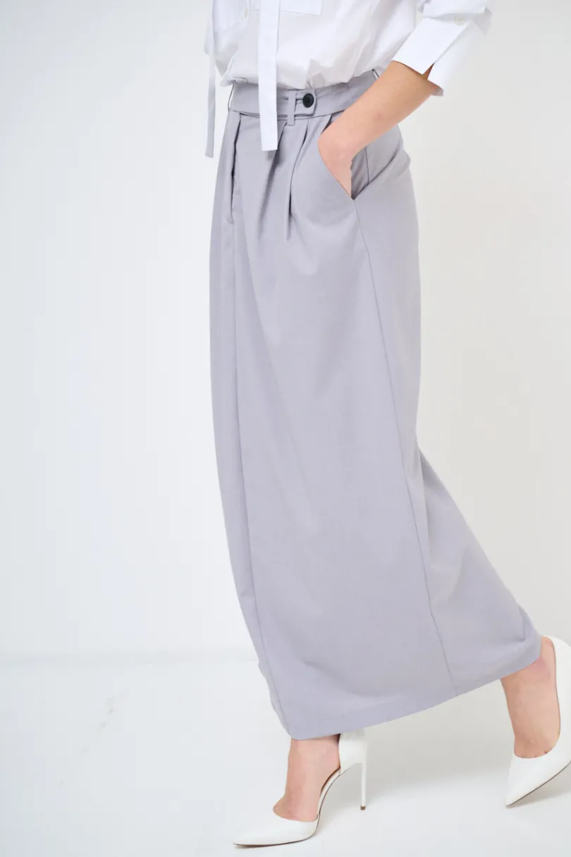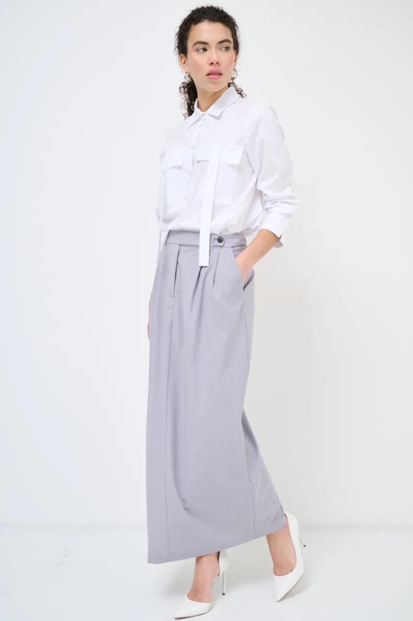 Gonna lunga con pinces, con tasche e ampio spacco laterale.