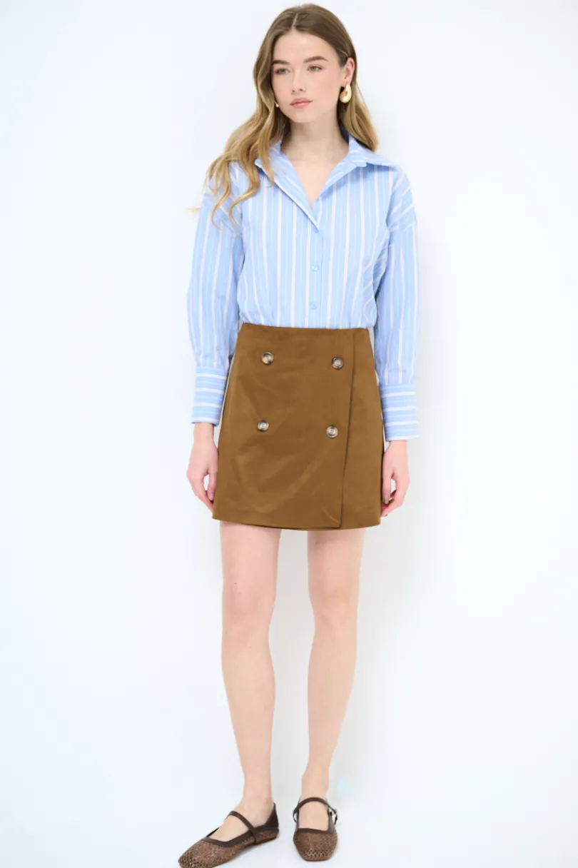 Minigonna in eco dainetto con abbottonatura a portafoglio.