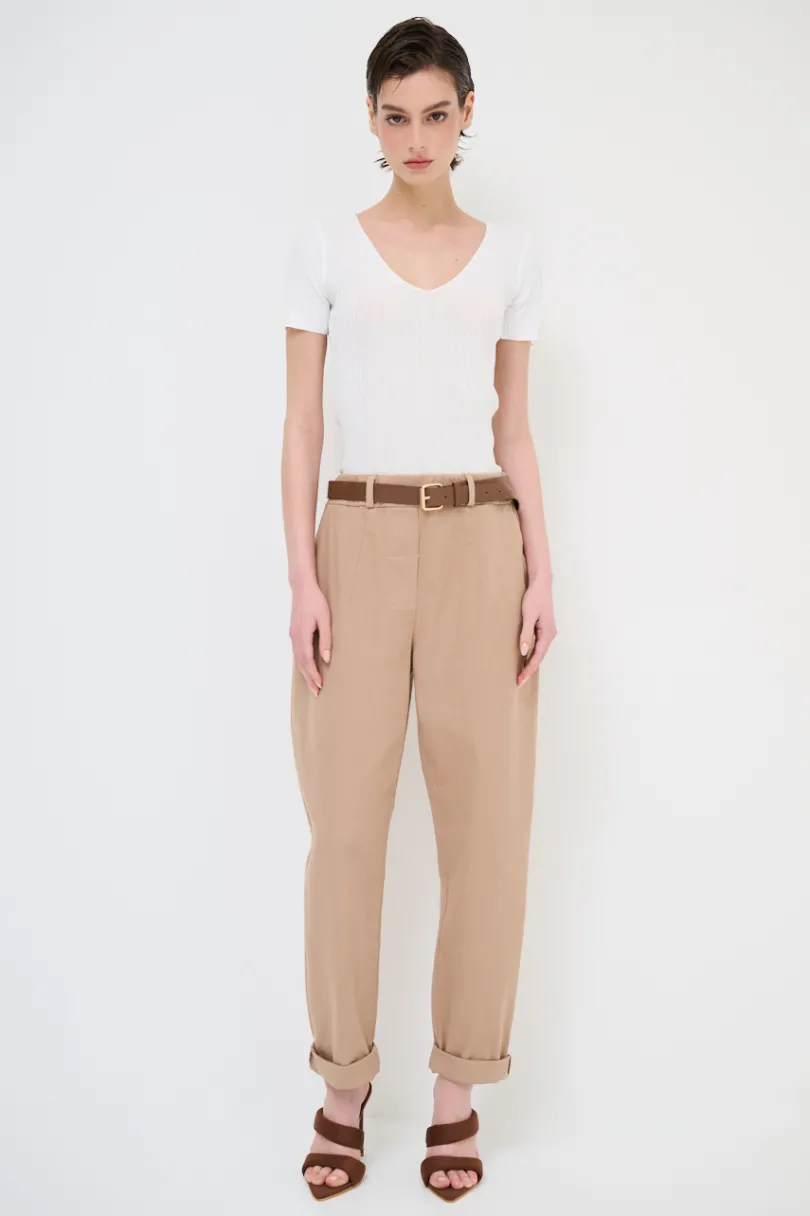 Pantalone dritto in cotone con tasche a filetto con bottone sul retro e cintura in vita.