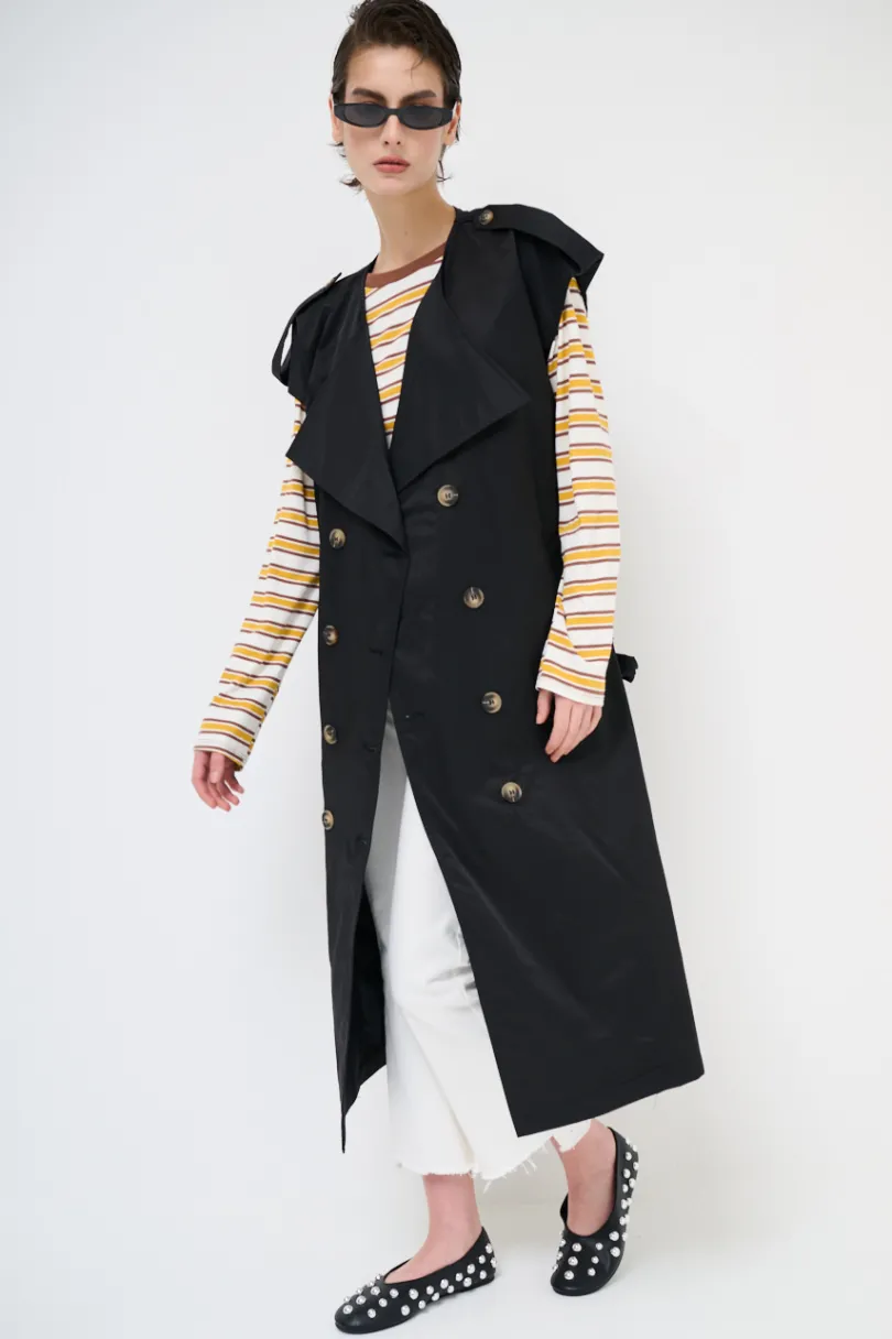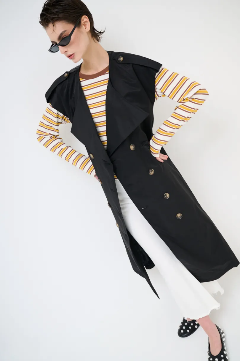 Trench lungo smanicato con collo rever ampio, abbottonatura doppiopetto e con cintura in vita.