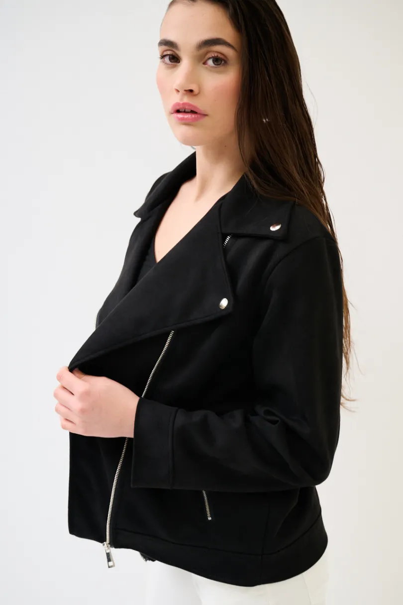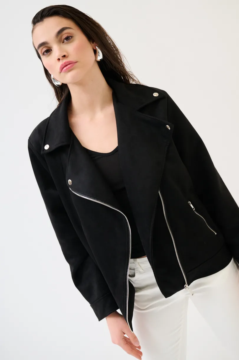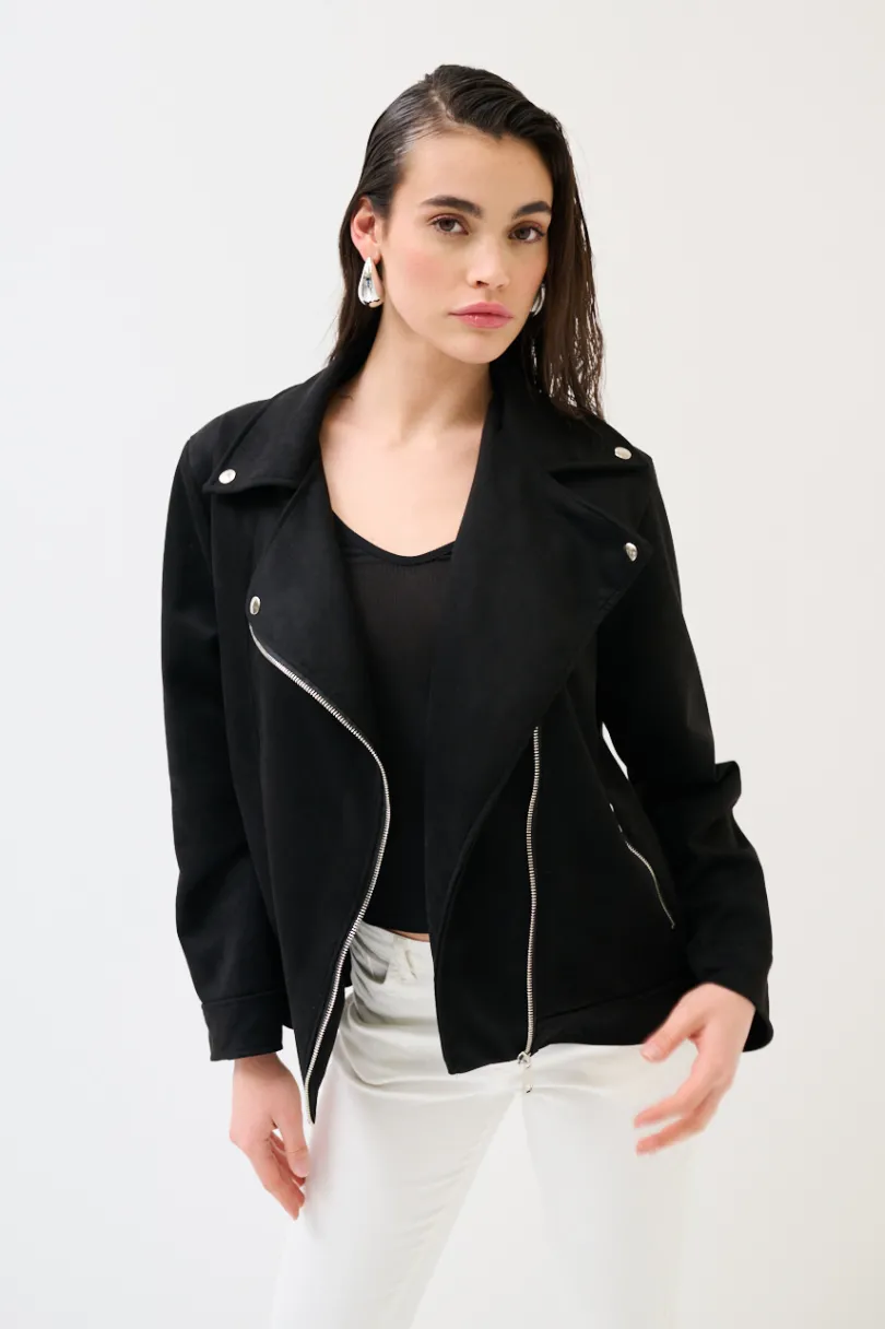 Giubbotto over in dainetto, con zip asimmetrica e colletto rever con borchie.