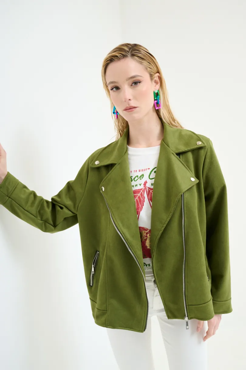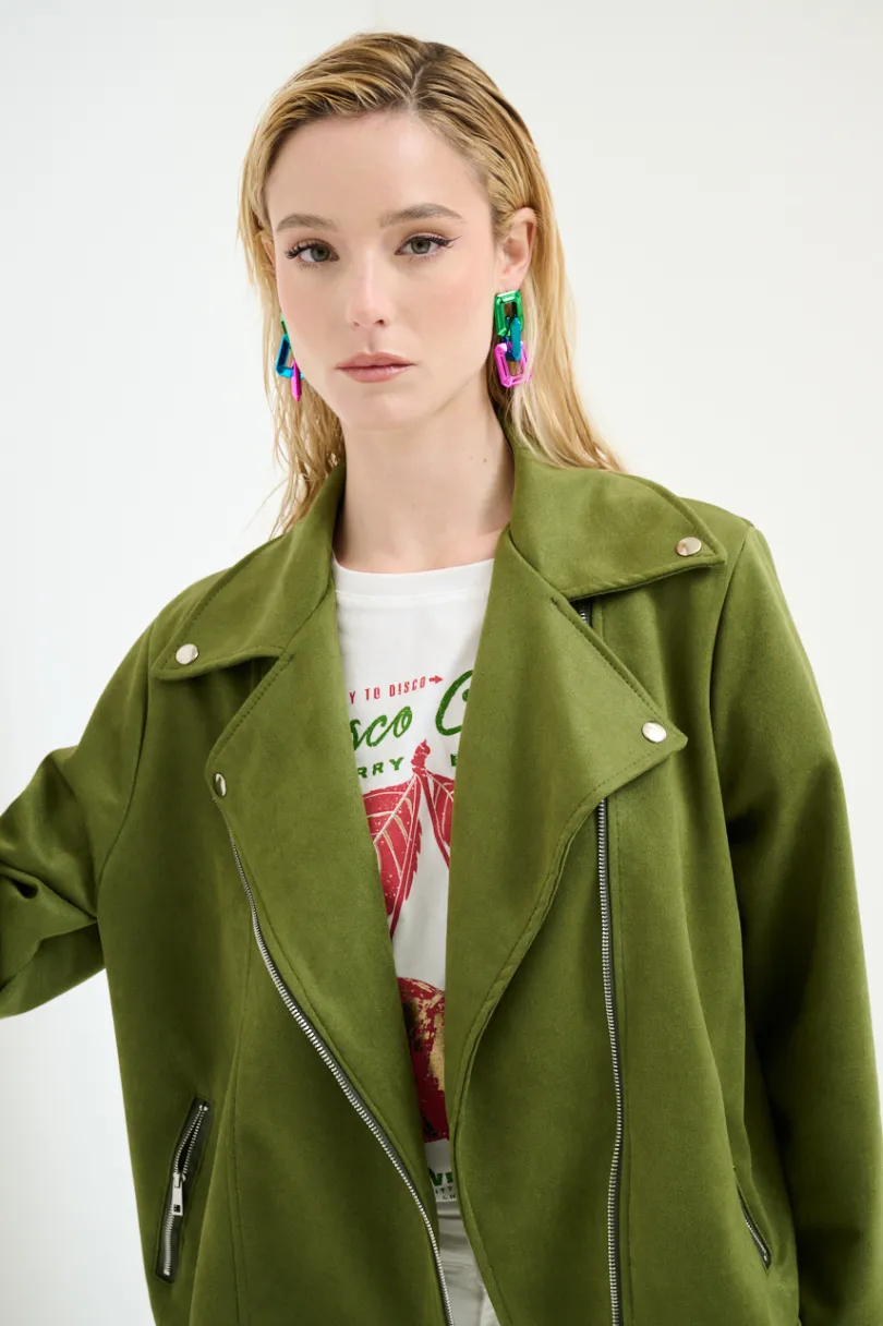 Giubbotto over in dainetto, con zip asimmetrica e colletto rever con borchie.