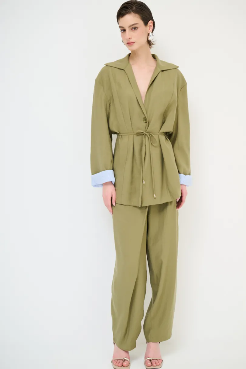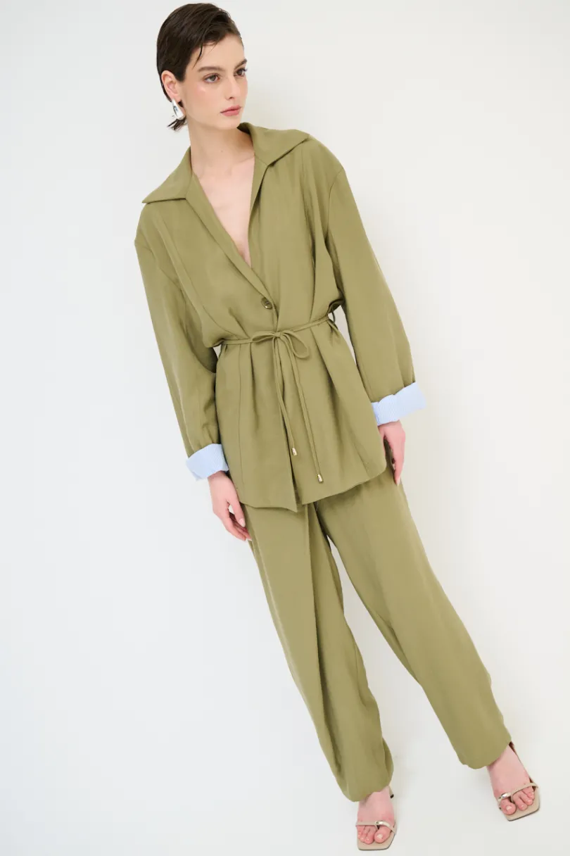 Giacca a due bottoni con fodera interna a righe con colletto e coulisse in vita.