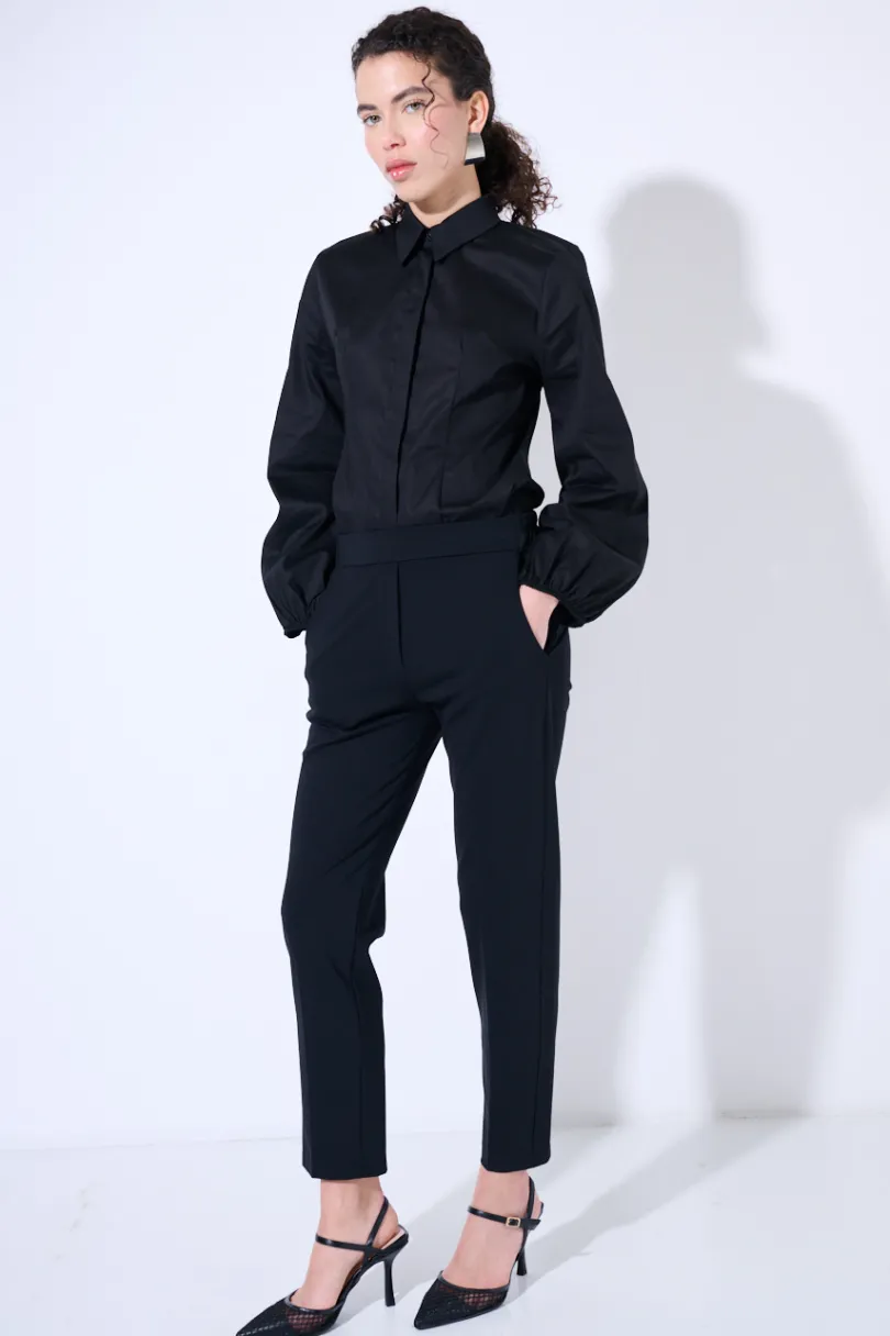 Pantalone classico in punto milano con piega, elasticizzato in vita.