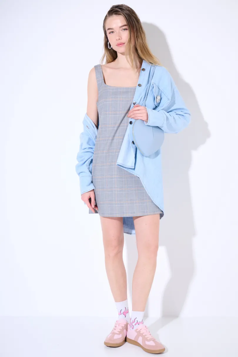 Abito corto smanicato tartan, con zip laterale nascosta.