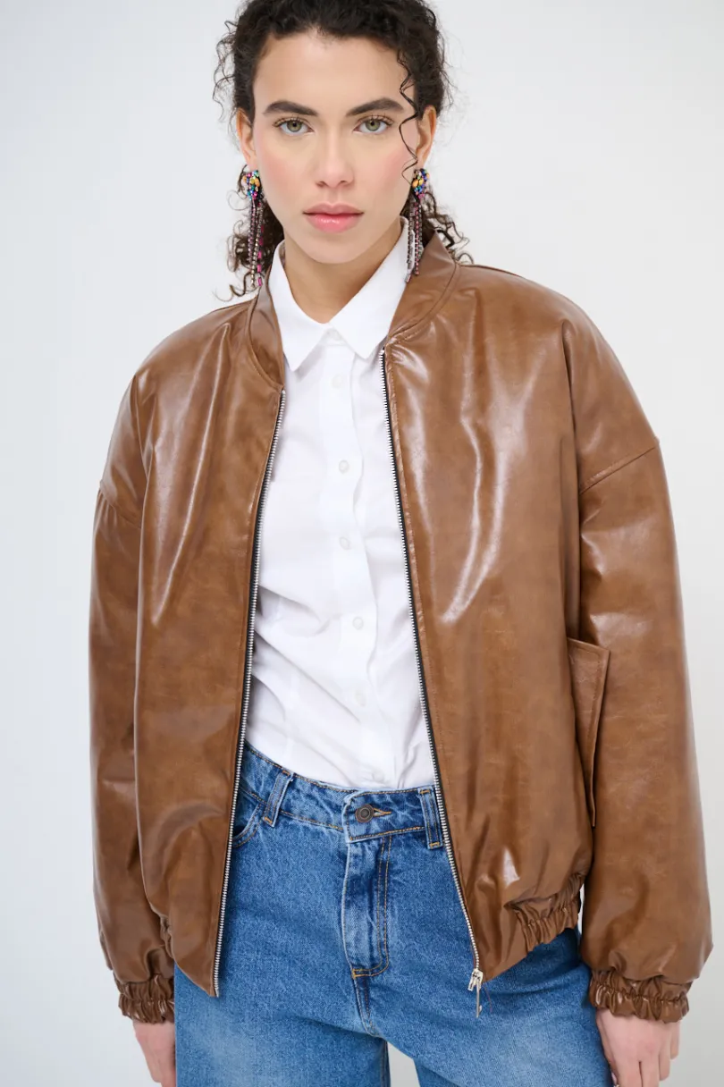Bomber imbottito in ecopelle con colletto a coreana, zip centrale ed elasticizzato sul fondo. Con tasche e manica calata.