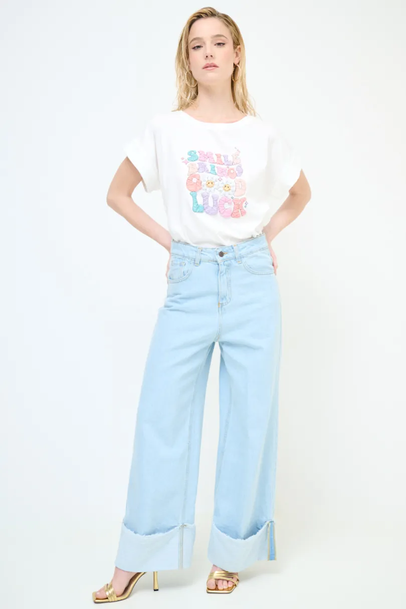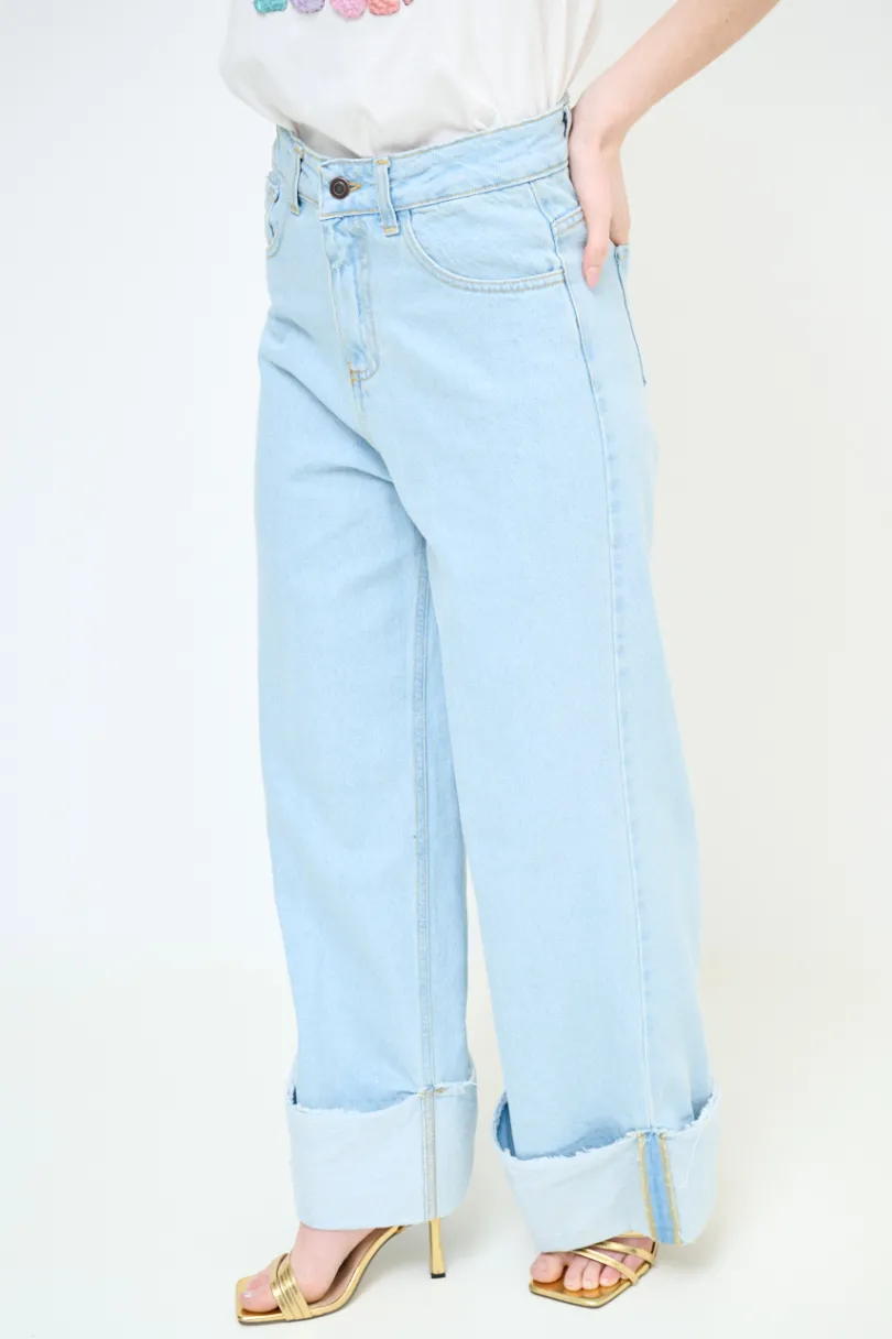 Jeans in denim dritto con risvolto ampio sfrangiato, lavaggio chiaro con cuciture a contrasto.