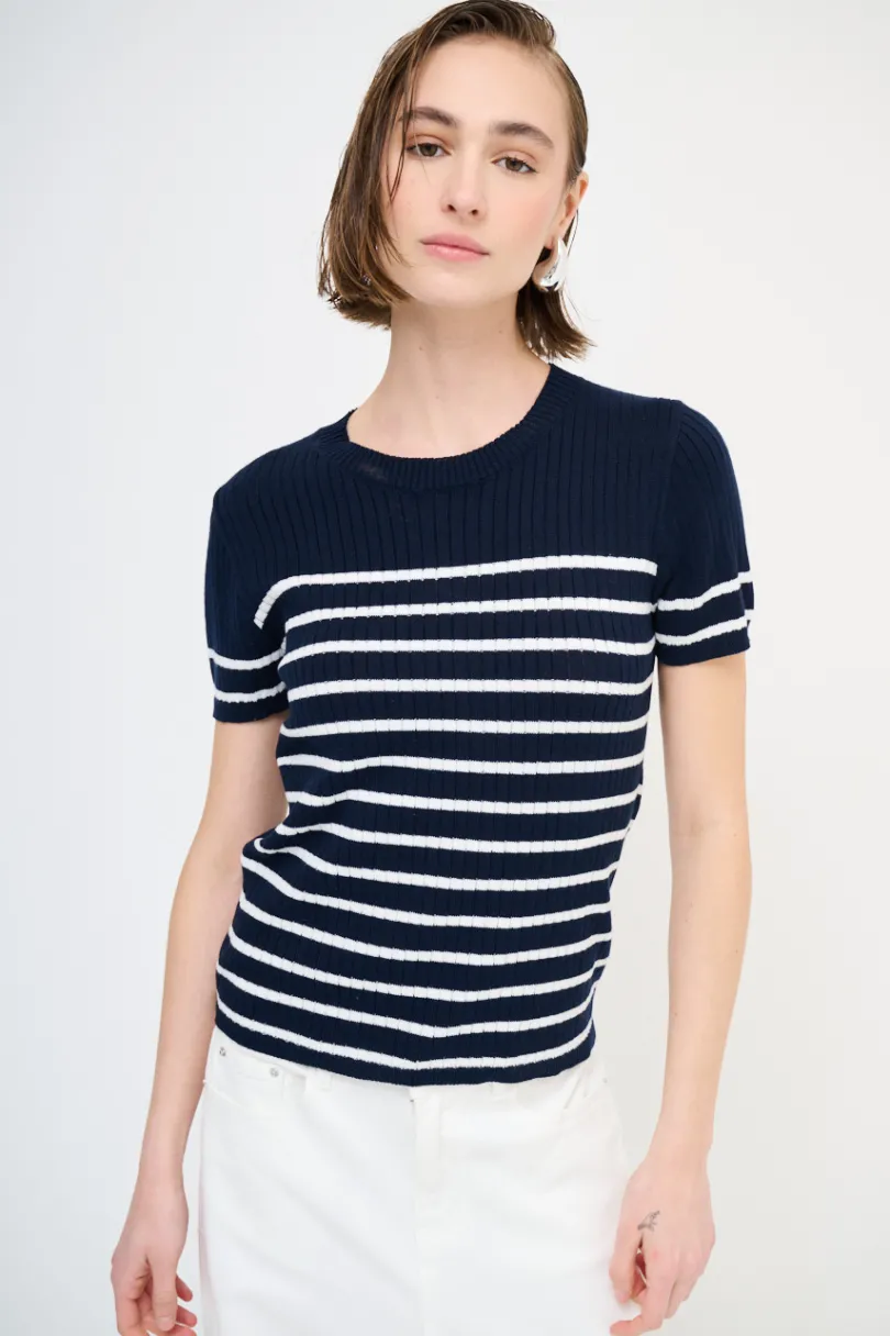 T-shirt a costine a mezza manica con righe verticali e girocollo.