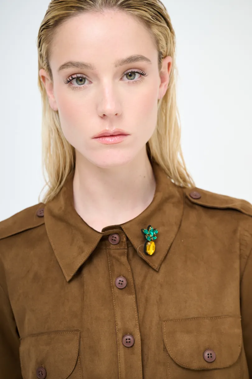 Camicia in eco dainetto con taschini frontali e abbottonatura, con spilla applicata sul colletto.