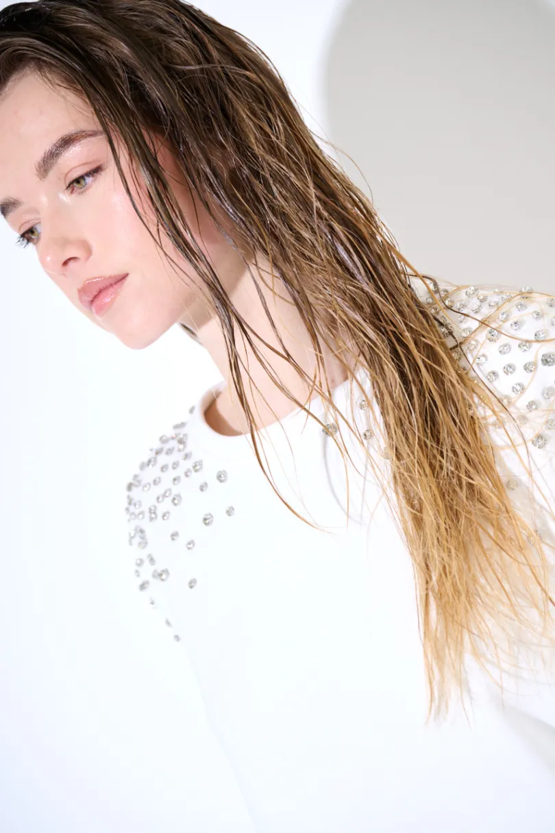 Felpa garzata over girocollo, dettagli gioiello sulle spalle, con manica lunga.