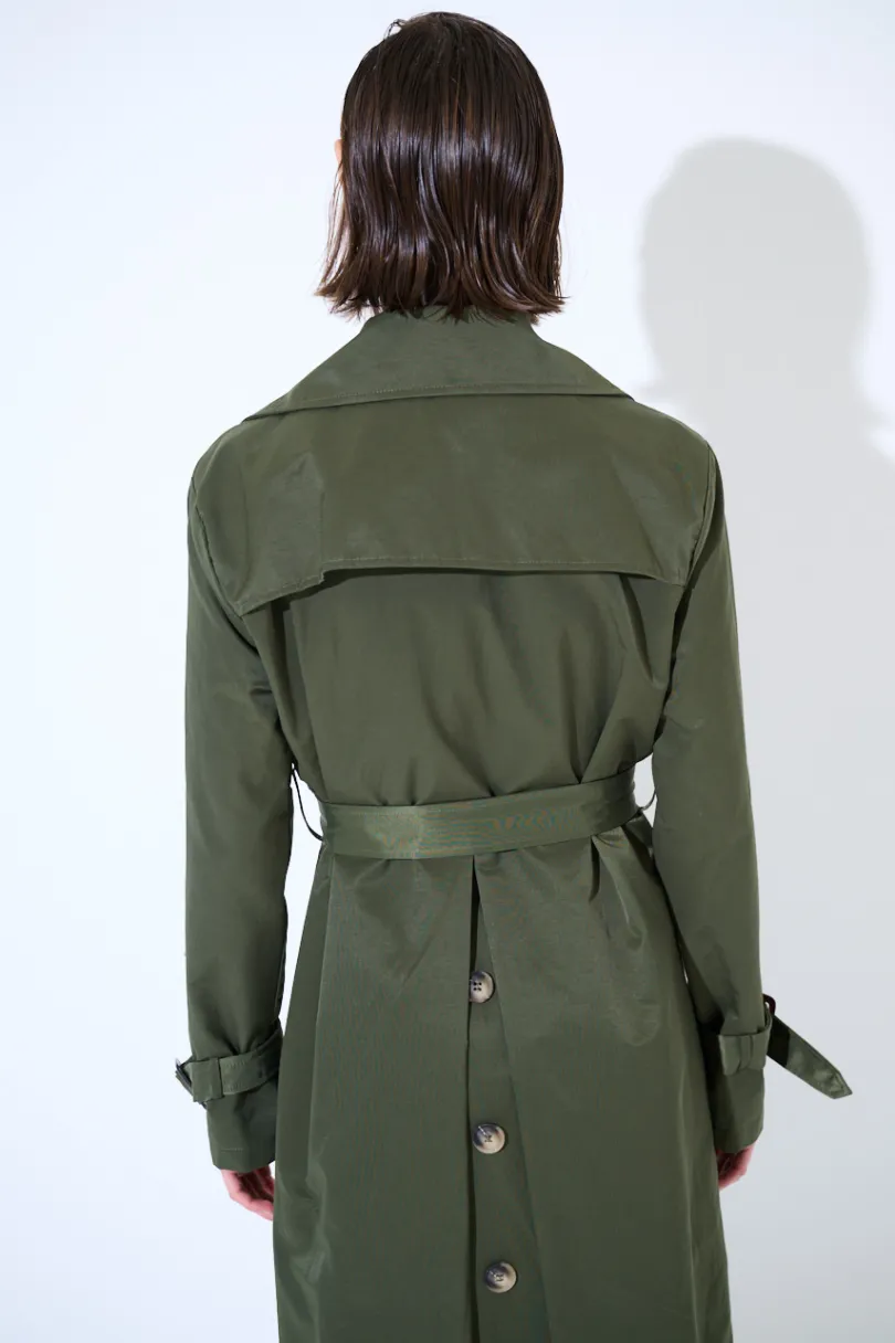 Spolverino trench a doppiopetto, con collo rever e cintura in vita, dettaglio di bottoni sul retro.