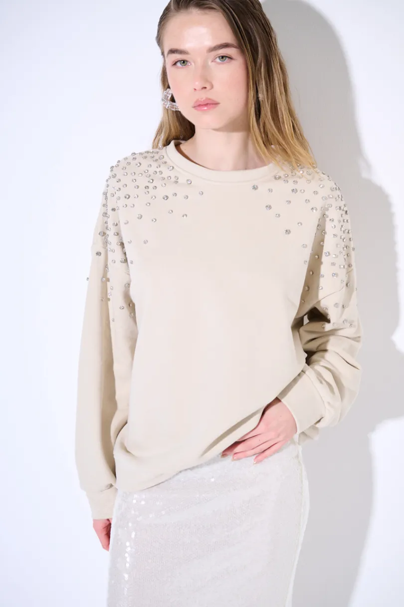 Felpa garzata over girocollo, dettagli gioiello sulle spalle, con manica lunga.