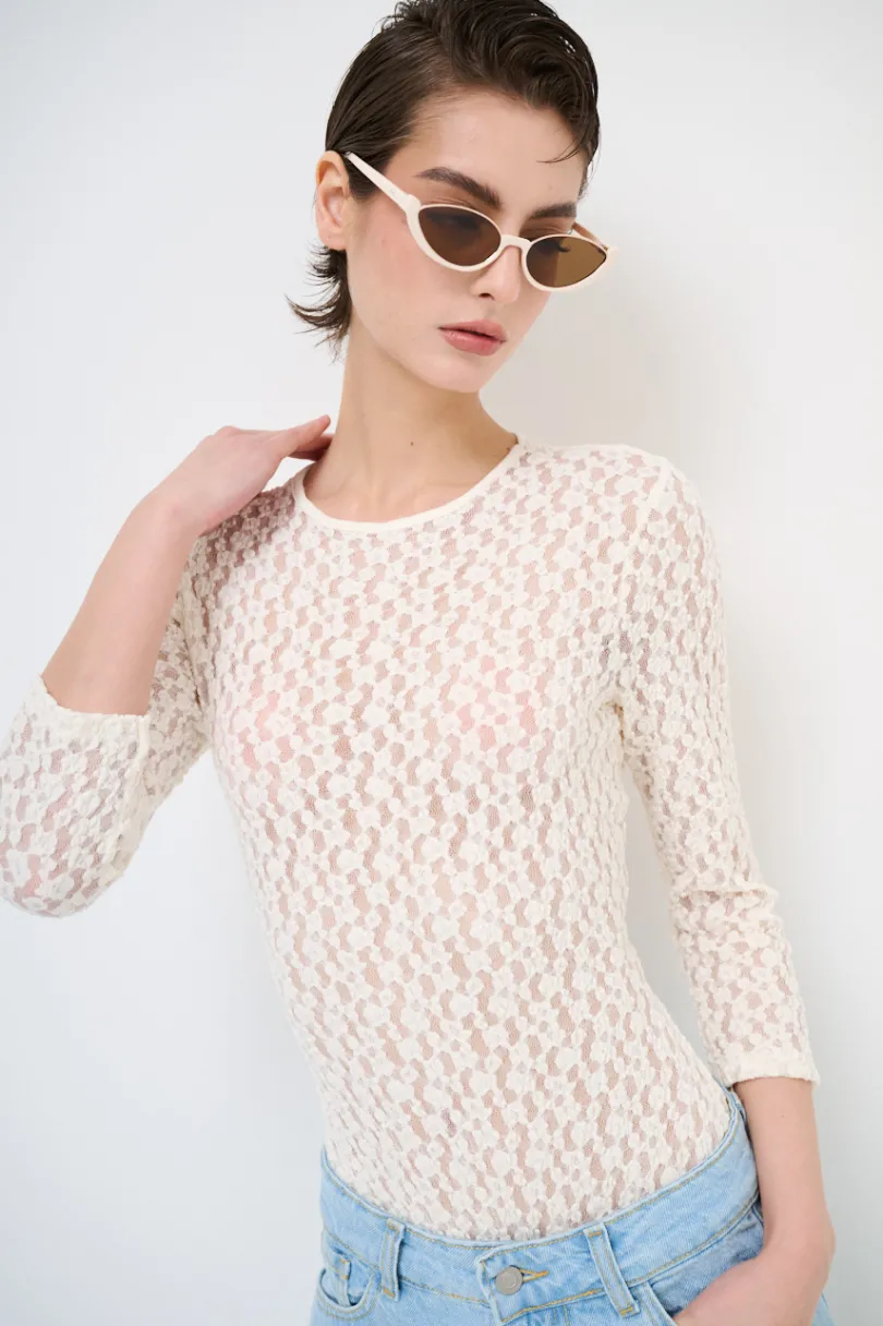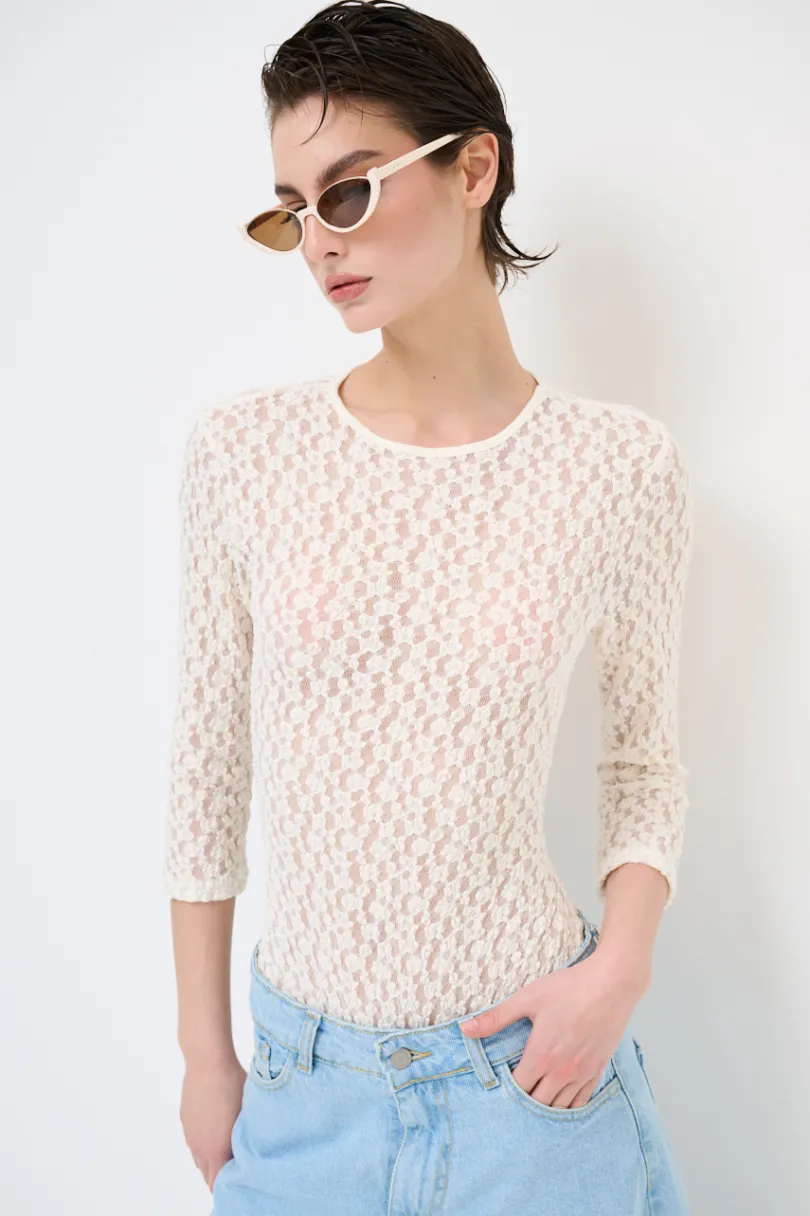 Maglia body semitrasparente con manica a 3/4, aderente e con girocollo.